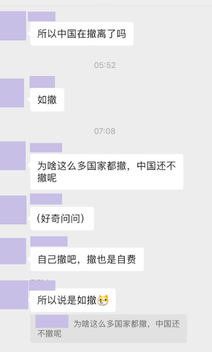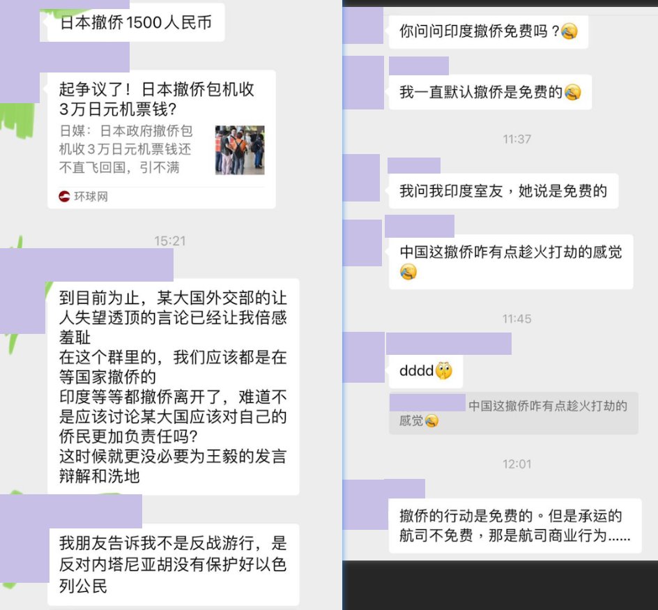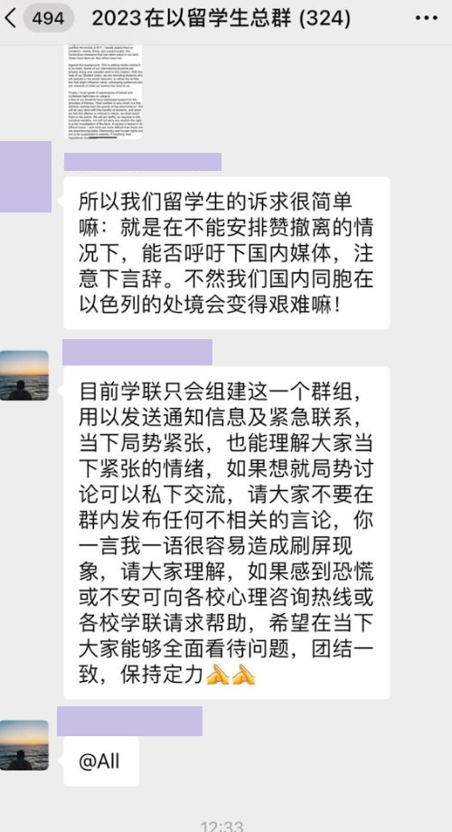 【中国驻以色列大使馆在撤侨和安抚之间选择了警告】 10月15日,网传以色列留学群聊天记录显示,目前大使馆依然没有关于何时撤侨的消息,使馆也基本不回复任何问题,而官媒还在嘲笑日本撤侨和假消息。同时中国外交部和王毅今天的言论也让人倍感羞耻。身边其他国家都撤侨了,只有中国人没走 而大使馆目前唯一做的就是给群里发言激烈的人打电话警告他们不要乱说话。同时在群里不许大家讨论局势。 有学生调侃,大使馆在撤侨和安抚之间选择了警告