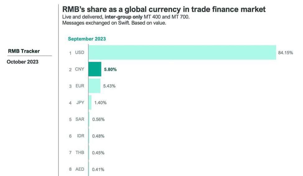 中國人民幣超越歐元,首次成為全球貿易第二主要貨幣——SWIFT人民幣在國際支付中的佔比從2023年8月的4.82%上升至9月的5.8%,創有統計近5年來的最高水平、美元仍然保持第一的位置——9 月份其在貿易結算中的份額從一個月前的 83.95% 上升至 84.15%。