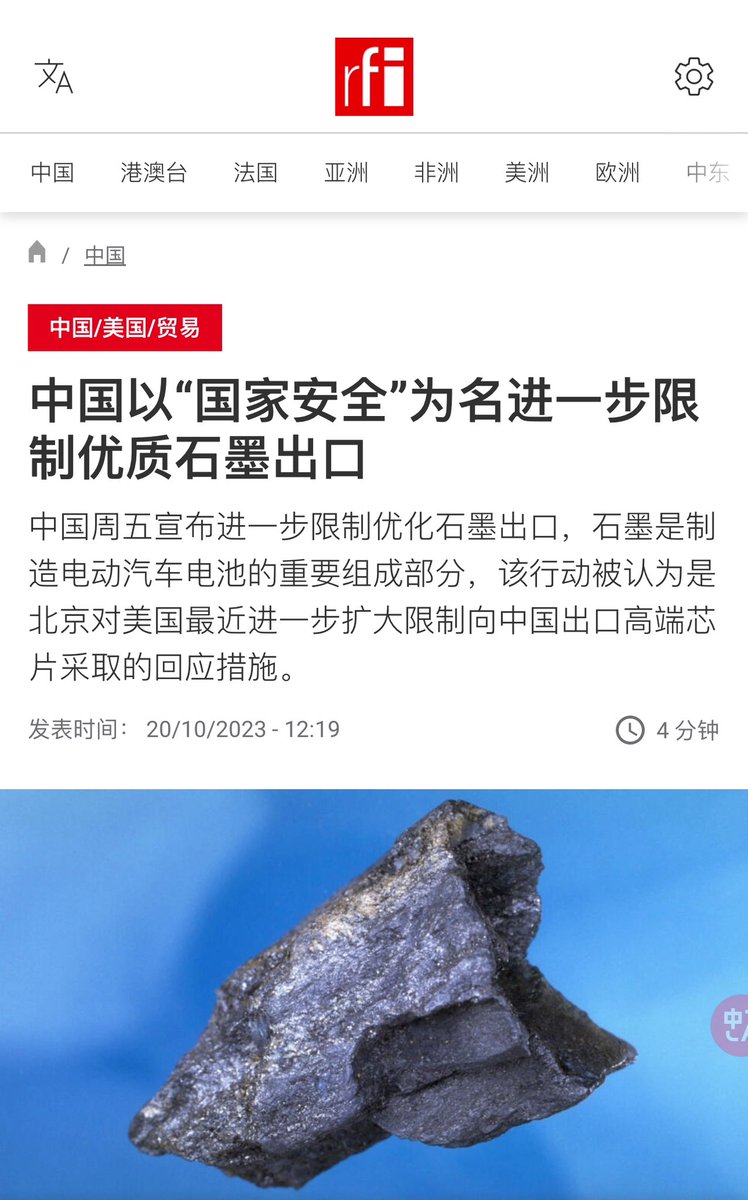 最近中国突然以国家安全为名,实施了石墨出口管制。这被视为芯片限制的回击,不过这次好像粉红和中共都没有大肆宣传这个事情。