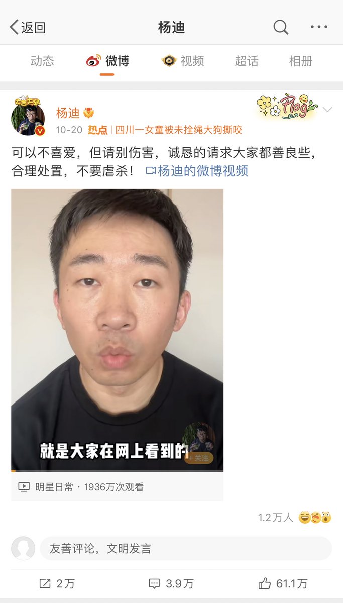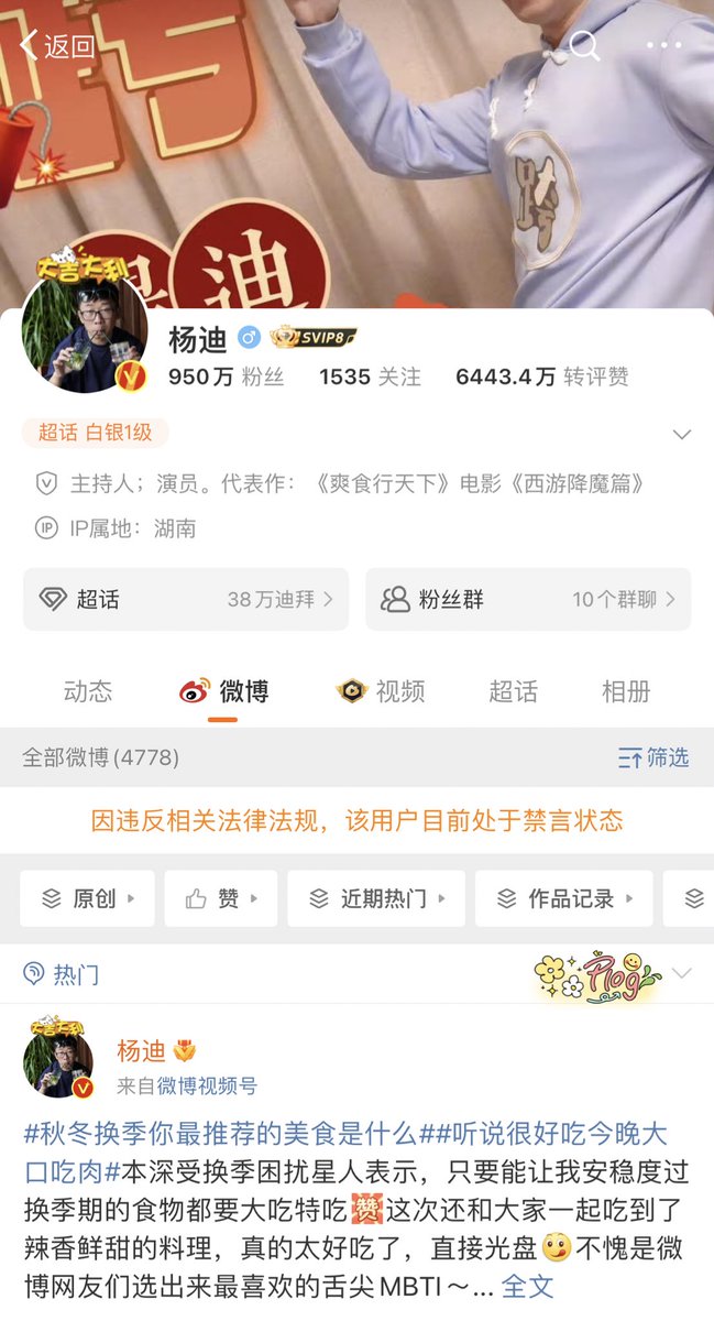 杨迪在呼吁不要虐杀宠物后。被微博禁言了。