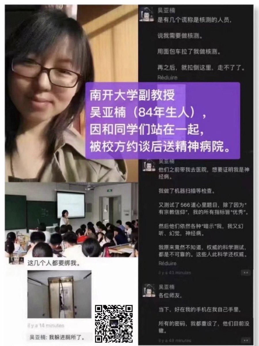 南开大学吴亚楠副教授白纸运动中被送入精神病院,一年来没有任何消息。请天津和南开大学的网友们跟踪了解,不要让她被遗忘。
