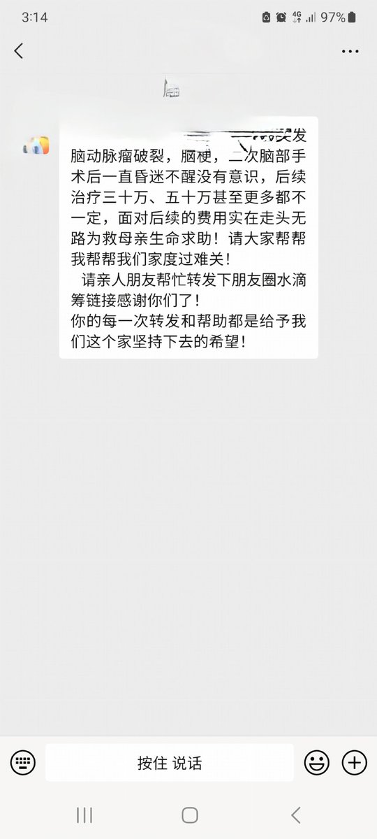 一个多年没联系的远房表弟昨天发起了水滴筹,他母亲刚查出来脑血管瘤破裂,治疗费用需要三十多万。我参与了水滴筹不过微信上没回他。