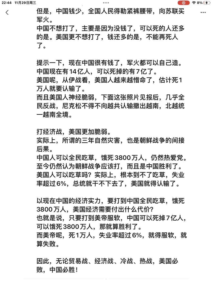 网文【冯小刚、贺卫方、张鸣论🇨🇳足球、法律、教育,文作者论中美之战】“中国人可以全民吃草,饿死3800 万人,仍然热爱党。至今仍然认为朝鲜战争应该打,而且是中国胜利了。美国人可以吃草吗?实际上,根本到不了吃草,失业率超过 6%,总统就干不下去了,美国就得认输了。”