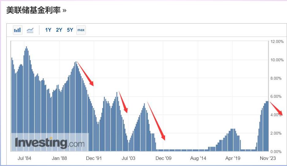 过去半个世纪美元基准利率走势图,基本上都是加息到顶峰后,半年内就会降息!