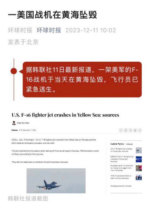 一架美军F-16战机在韩国进行例行训练时于11日在黄海坠毁,飞行员成功跳伞后被韩国方面救起。此前一天,中国宣布在黄海北部海域进行实弹演习。