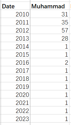 我整理了一下,从2010年到现在,英国男孩取名中,“穆罕默德”这个名字的排名。很有意思,从2014年开始,“穆罕默德”突然跃升27位占据第一位。从此以后,十年来,只有2016年有一次屈居第二,其余年份“穆罕默德”都是第一位。。。这个数据很准确,是我从babycentre(BBC此新闻来源网站)一个个拷贝出来的。