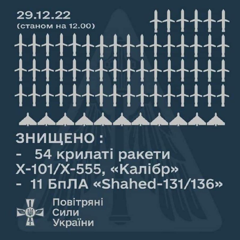 💠乌克兰武装部队空军称12月29日针对乌克兰的袭击是22个月以来俄罗斯侵略者对乌克兰发动的最大规模的空袭。 经确认,158 个敌方目标中共有 114 个被摧毁。