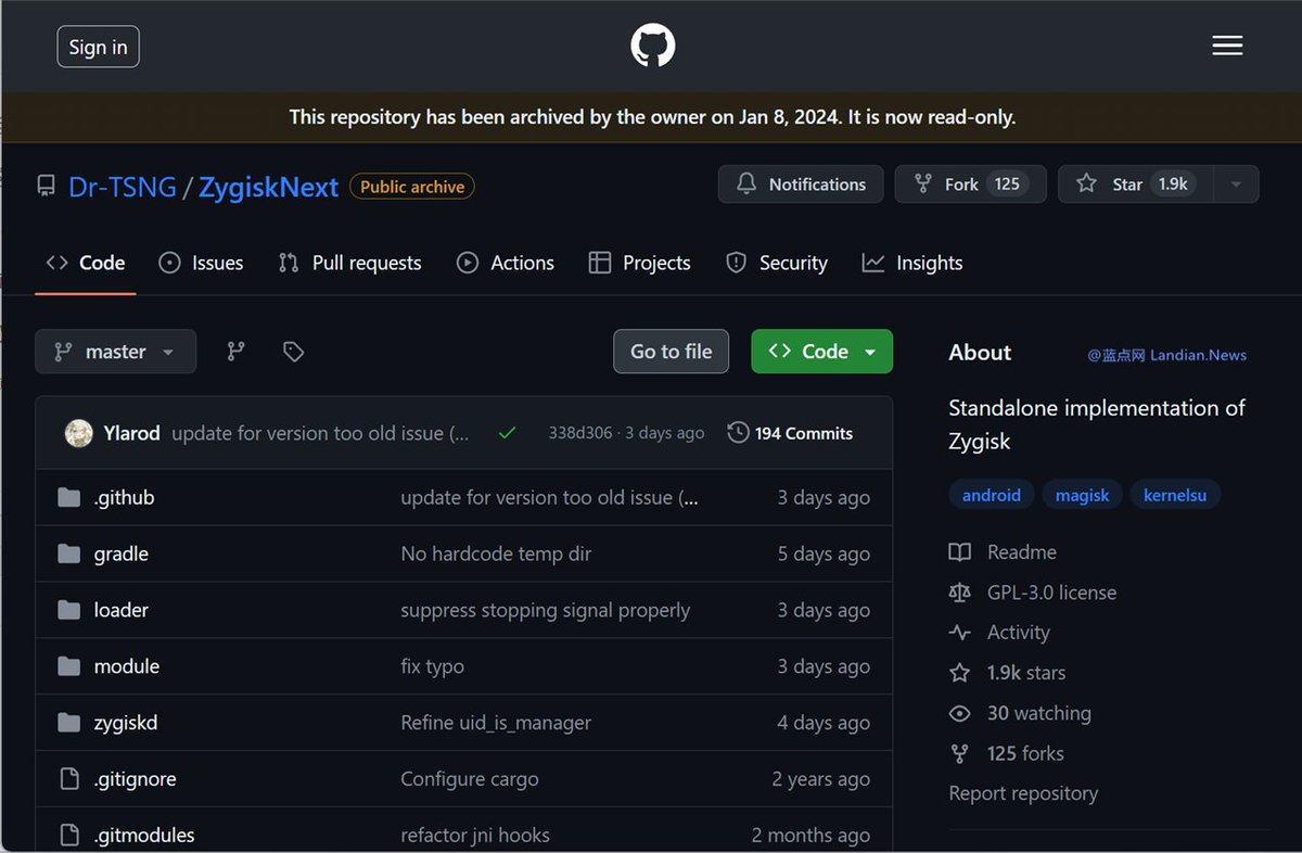 其中开源的 Zygisk Next 和 KSU 的 GitHub 存储库已经被设置为存档,Shamiko 未开源不过开发者也表示停止维护。