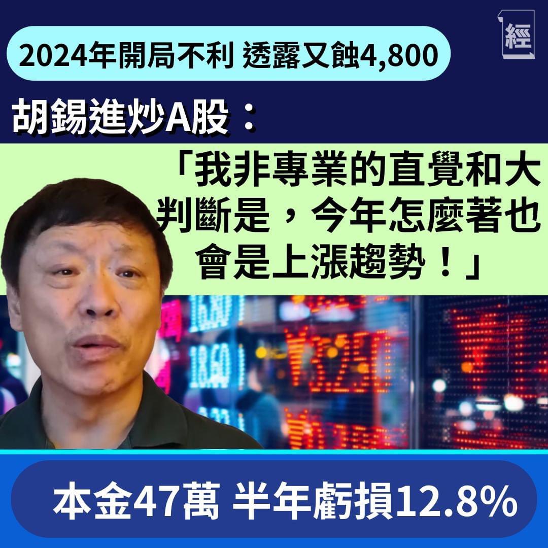 2024年剛過1週多,中國央視就迫不及待宣佈「中國經濟火熱開局」,這是「唱響中國經濟光明論」的必然現象。但是,老喉舌胡錫進抱怨開年一週其股票又虧了4800元。老胡有「反賊」的苗頭了。