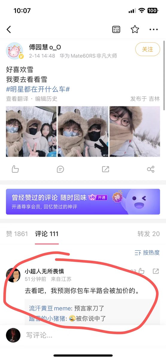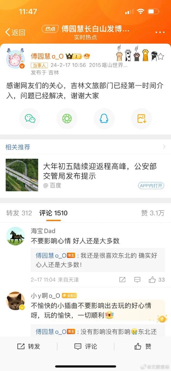 以“洪荒之力”“泥石流”闻名的游泳运动员傅园慧,发微博说想去东北看雪。底下熟悉东北的粉丝评论说,“我预测你包车半路会被加价的”,结果果然如此。司机在雪地里开始勒索。傅园慧上微博求助后,吉林文旅部门联系司机解决。并罚款3万元。问题是,游客里有几个人能有傅园慧的影响力呢?