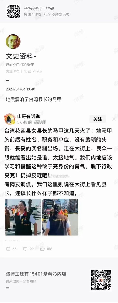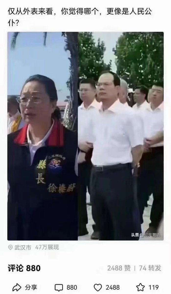 同是行政夹克,我堂“公仆”做事不敢留名…【地震震响了台湾县长的马甲】她马甲胸前绣有姓名、职务和单位,没有繁琐的头衔,妥妥的实名制出场,走在大街上,民众一眼就能看出她是谁,内地应该学习借鉴这种勇气,脱下行政夹克!网友调侃,我们这别说在大街上看见县长,连镇长什么样子都不知道。