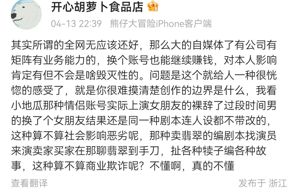 处理小学生巴黎找作业的摆拍造假视频,给人一种很恍惚的感觉。现在网络上到处都是这类食品,情侣帐号里的情侣都是假的,前一个辞职了换个新人继续以前的剧本和人设演,算不算社会影响恶劣?卖翡翠的找托来演卖家在那聊,算不算商业欺诈。你处理的过来吗?