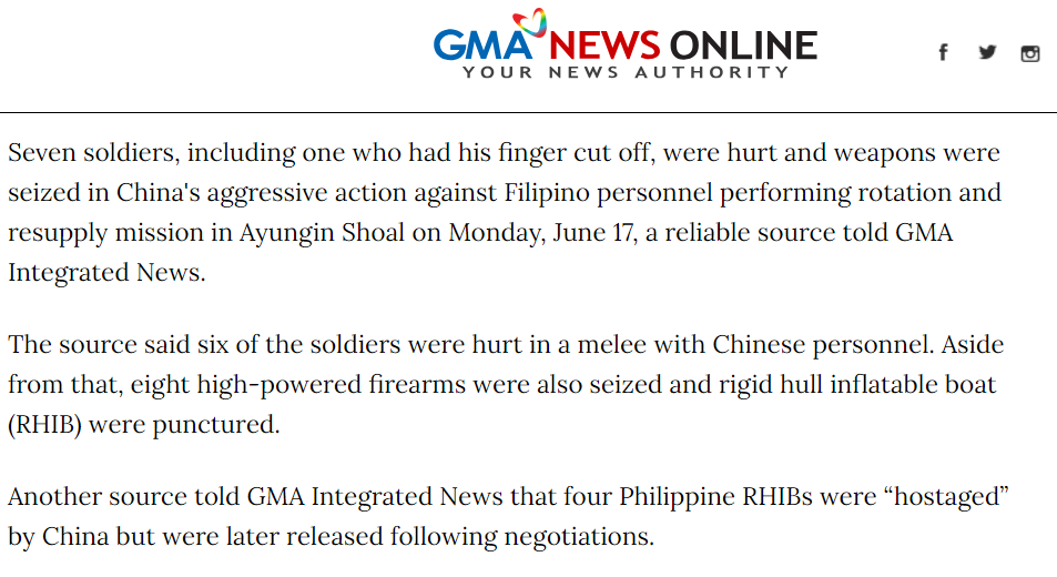 据菲律宾媒体GMA新闻报道,消息人士称中国海警周一在仁爱礁接触事件中收缴了菲律宾军队的武器,七名菲律宾士兵在混战中受伤,其中一名士兵手指被砍断,一艘硬壳充气艇被刺穿。另一消息人士称,中方扣押了四艘充气艇,后经谈判后归还。