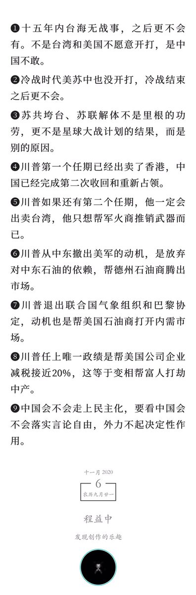 ❶十五年内台海无战事,之后更不会有。不是台湾和美国不愿意开打,是中国不敢。❷冷战时代美苏中也没开打,冷战结束之后更不会。❸苏共垮台、苏联解体不是里根的功劳,更不是星球大战计划的结果,而是别的原因。❹川普第一个任期已经出卖了香港,中国已经完成第二次收回和重新占领。❺川普如果…⬇️