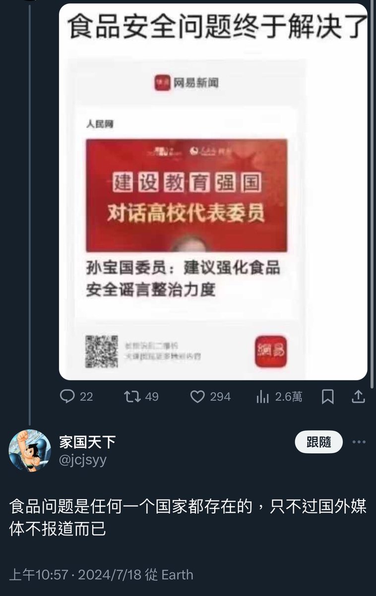 “食品安全问题是任何一个国家都存在的,只是国外媒体不报道而已”。😅