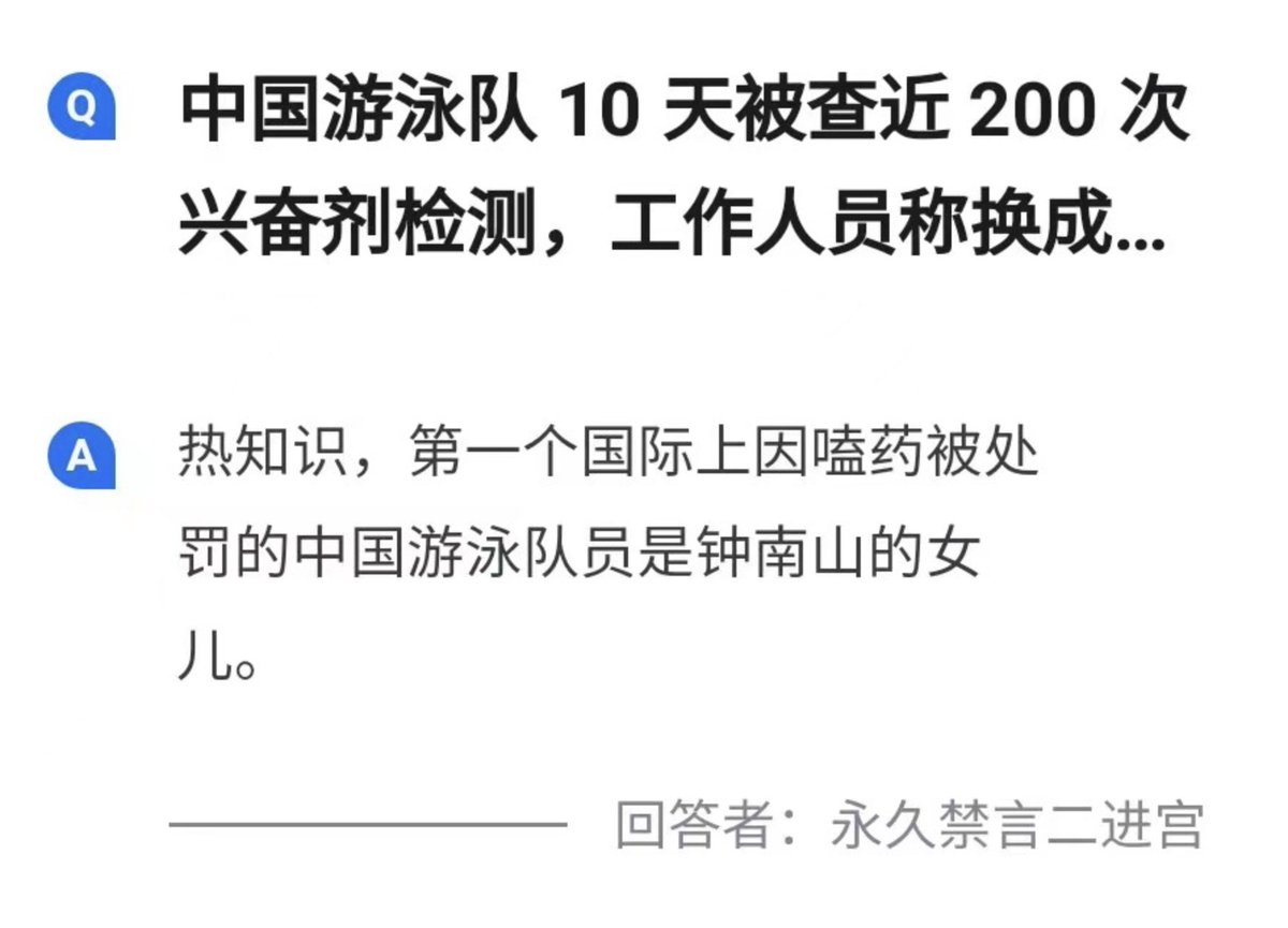 冷知识:钟南山女儿是第一个在国际上因嗑药被处罚的中国游泳运动员。(其实不对,不是第一个)