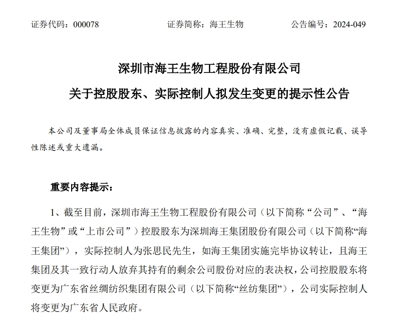 7月30日晚间,深圳知名药企海王生物发布公告称,海王生物的实际控制人将变更为广东省人民政府。