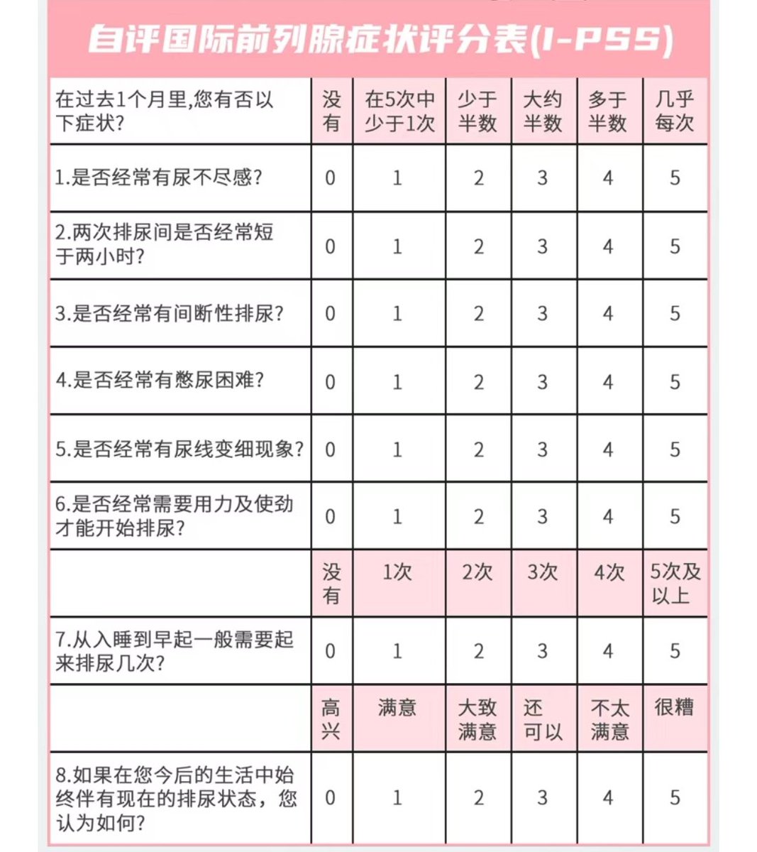 国际前列腺症状自评表:以下8题得分相加,总分0-7分为轻度症状;8-19分为中度症状;20-35分重度症状。