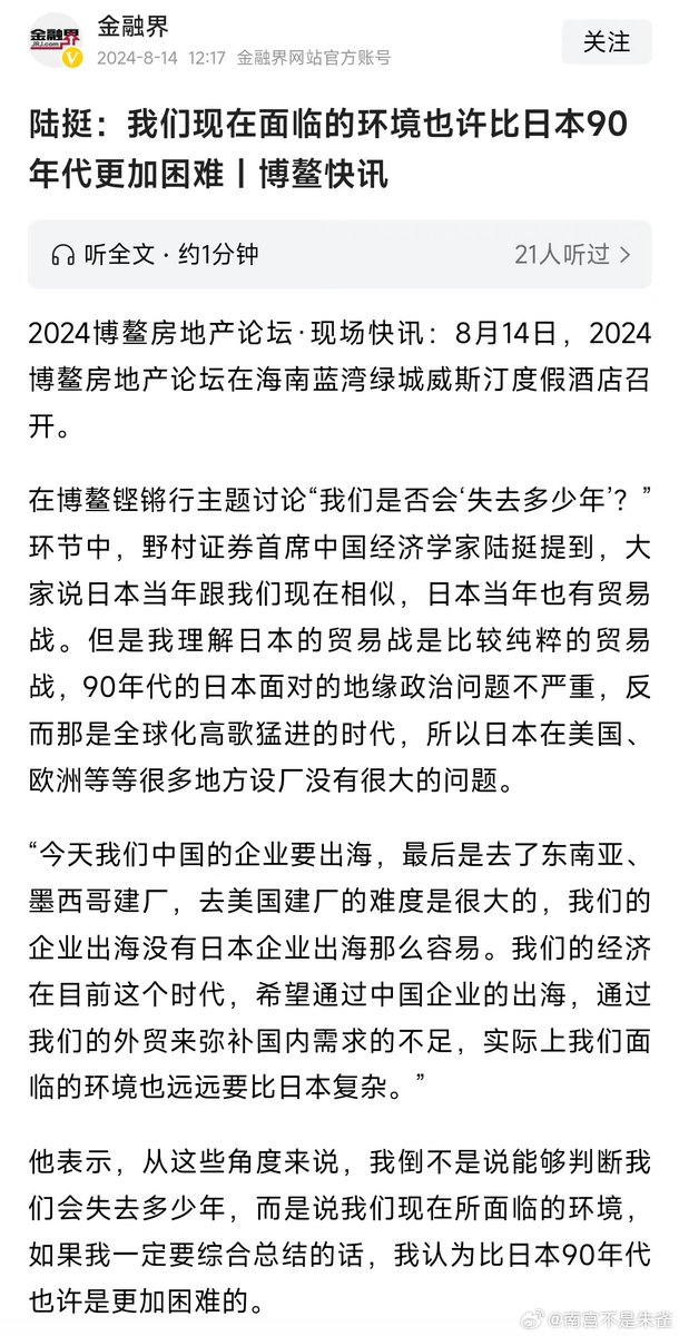 8月14日,博鳌房地产论坛召开,中国经济学家陆挺表示“我们现在面临的环境也许比日本90年代更加困难”