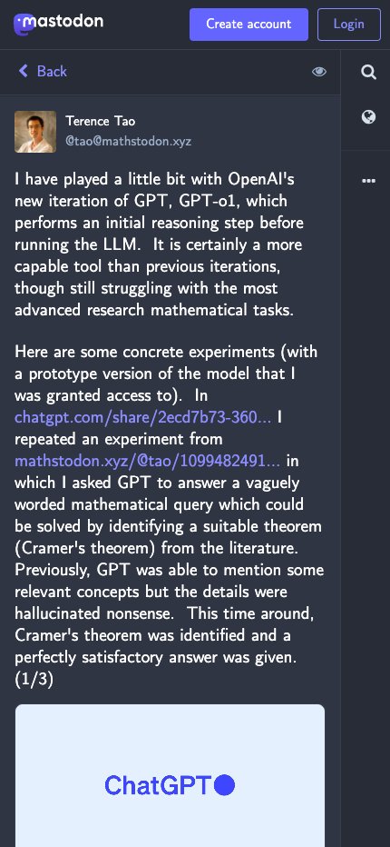 陶哲轩对 o1 的点评:更强大,但是在处理最复杂的数学研究任务还不够好,就像指导一个水平一般但不算太无能的研究生。