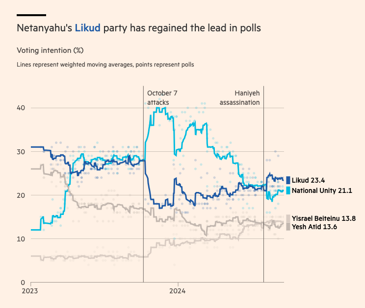 唉,Netanyahu的策略成功了,尤其在伊朗刺杀哈尼亚后,利库得集团的支持率重新夺回第一,靠无限延长战争,他居然真的挽回了自己的政治生命。
