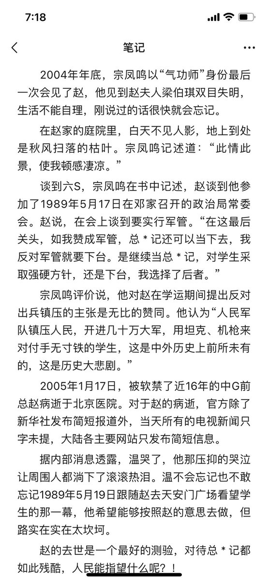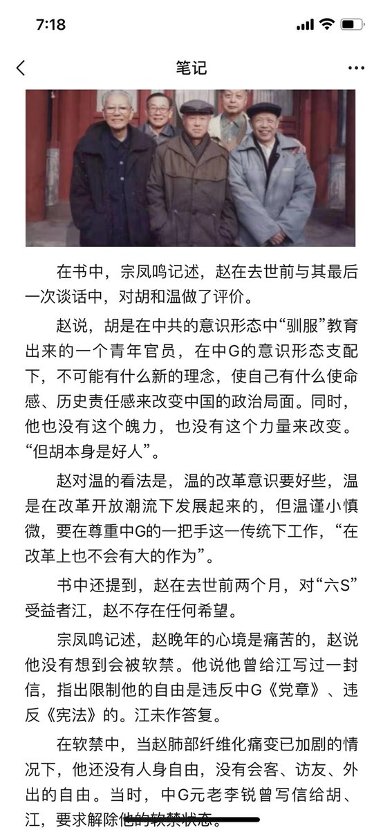 赵紫阳临终前对中共上届领导班子胡和温的评价被披露出来,而对“六四”获利者江的态度也有表述。  赵的老战友宗凤鸣,在赵软禁期间以气功师名义去赵家,从1991年到2004年,前后达上百次之多,最后写下《赵紫阳软禁中的谈话》一书。