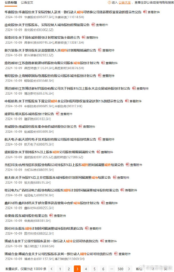国庆后第一天股票暴涨,同时A股大股东的减持公告也整整贴了三页。目前上证进入回调状态。