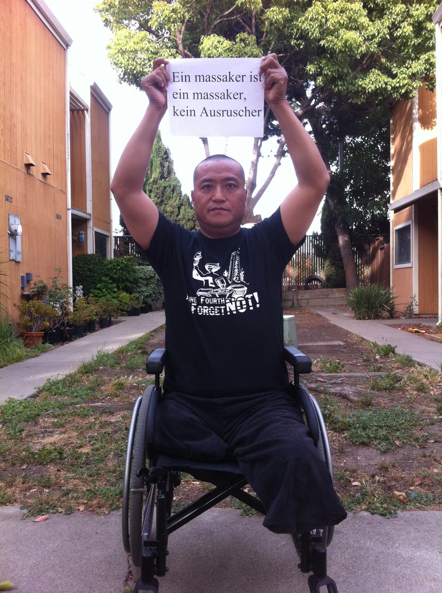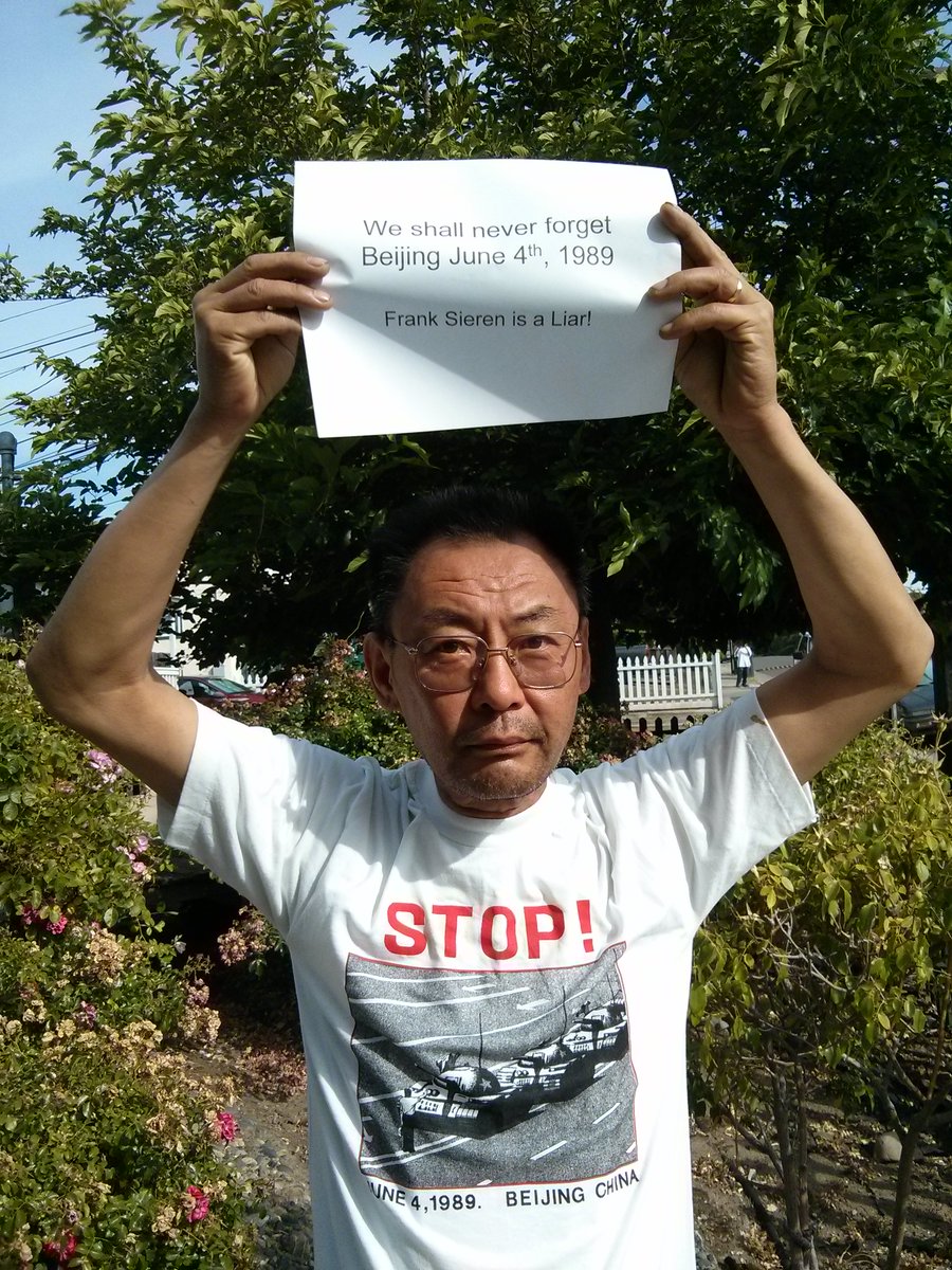 下面是六四大屠杀见证人方政先生、以及人道中国前主席葛洵的抗议图片。