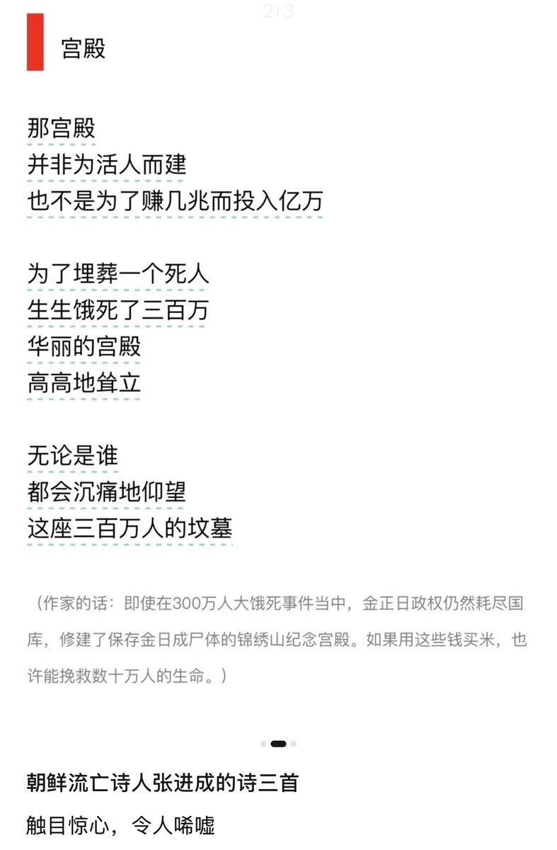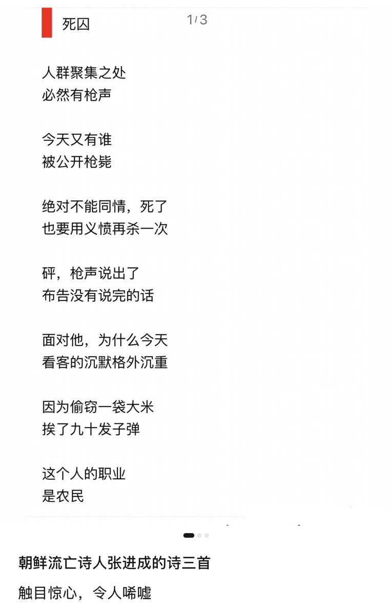 11月3日(发布) 公众号“多思考一点”刊登了朝鲜流亡诗人张进成的三首诗。 字字泣血,触目惊心。