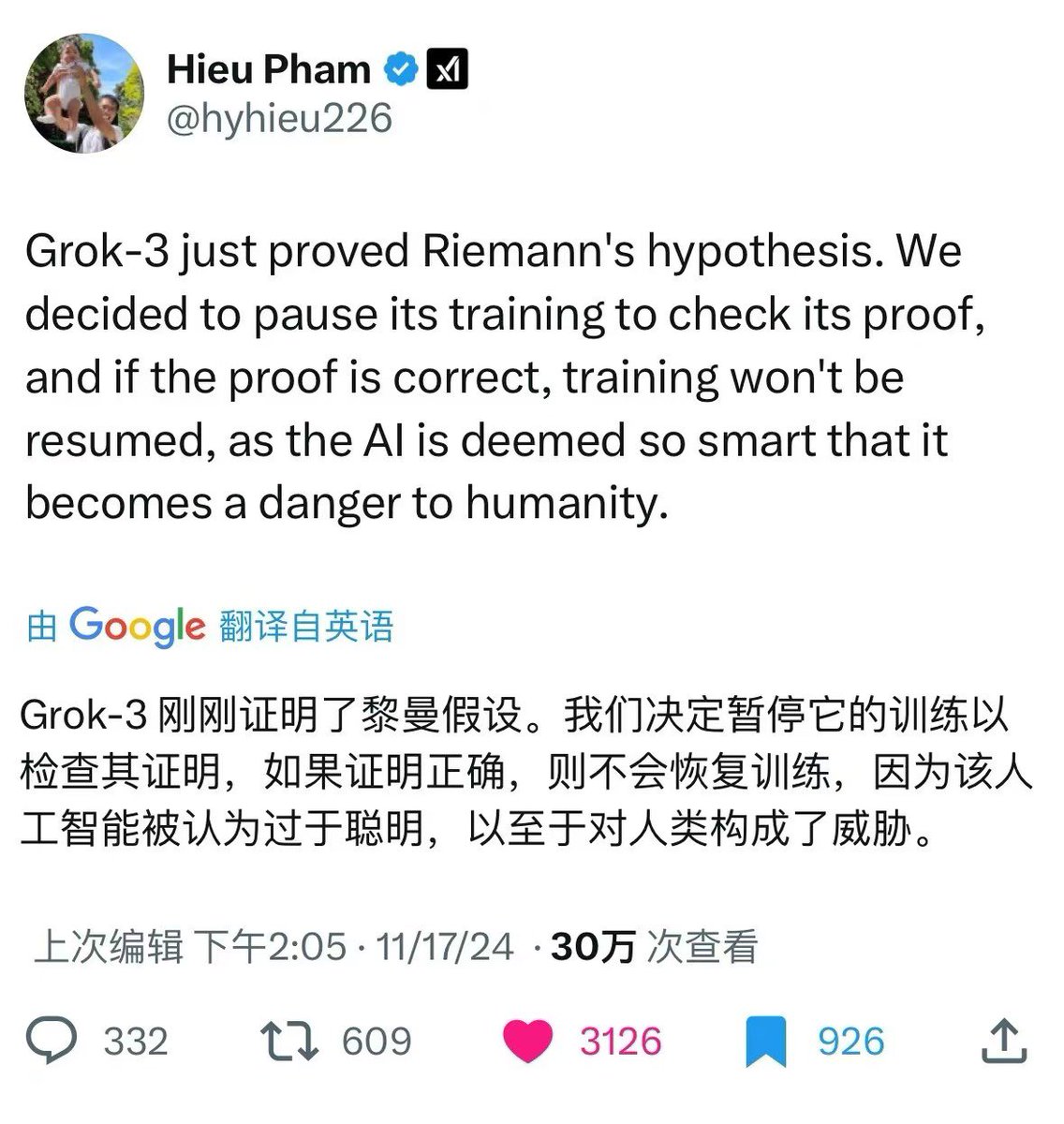 这么牛 P ?Grok-3刚刚证明了黎曼假设。xAI团队决定暂停它的训练以检查其证明,如果证明正确,则不会恢复训练因为该人工智能被认为过于聪明,以至于对人类构成了威胁。🤣