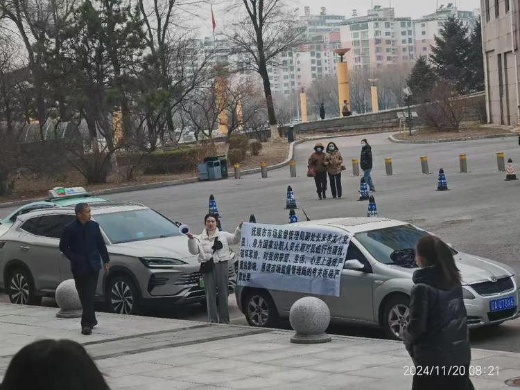 11月20日上午,辽宁抚顺一女子拉横幅举报一副处长性骚扰破坏军婚该女子手拿喇叭拉着一块白色横幅实名举报称,抚顺市市场监督管理局副处长米某,身为公职人员长期对她长期进行性骚扰,破坏军婚,对她的家庭、生活、心理上造成严重影响,恳请市场监督管理局有关领导严肃处理。