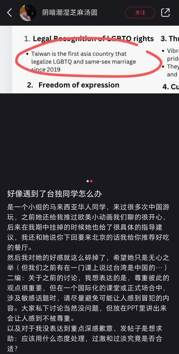 一小红书集美在马来西亚留学,在本地同学的课堂展示中敏感捕捉到“台湾是亚洲首个同婚合法化国家”这句话里的台独信号,向网友讨教应对手段
