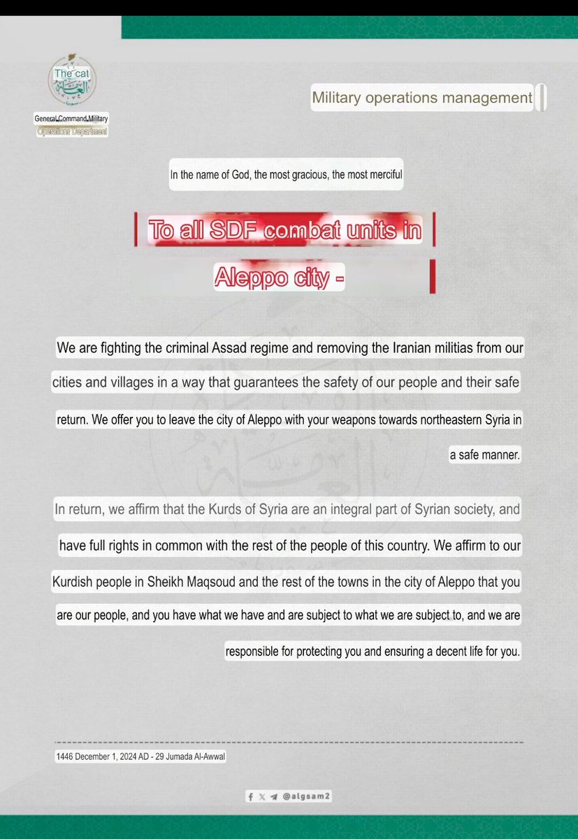 最新消息:叙利亚反对派HTS 盟军提议 SDF (库尔德军阀组织)带着武器安全离开阿勒颇前往叙利亚东部。他们承诺会保护谢赫马克苏德的库尔德人,并承认他们是叙利亚社会平等的一部分