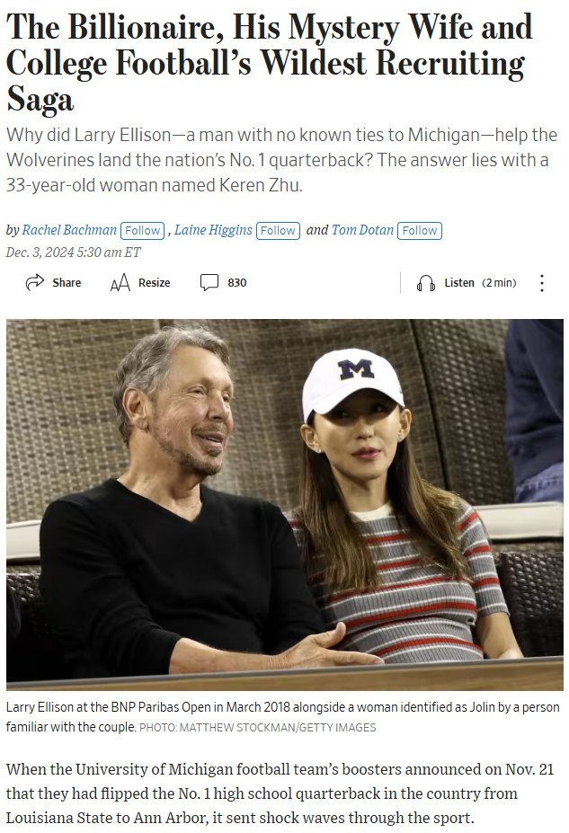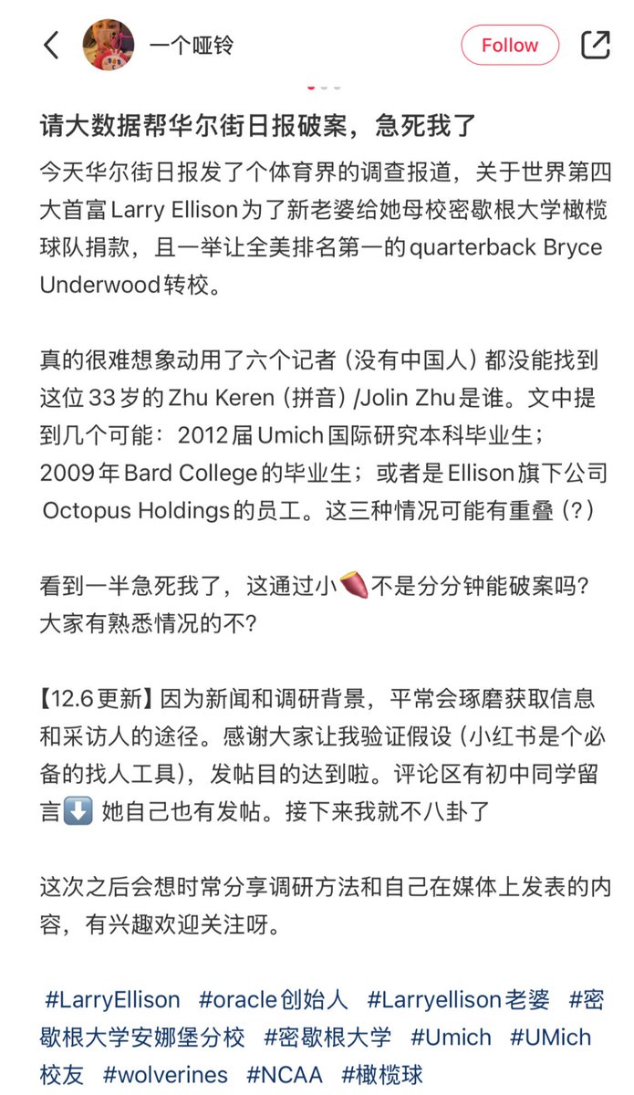 甲骨文董事长Larry Ellison(80岁)的第五任太太被爆是个中国人KeRen Zhu。网上传出不少小道消息。传说她是东北育才外国语学校读初中,然后到美国读的高中,26岁跟Ellison结婚。
