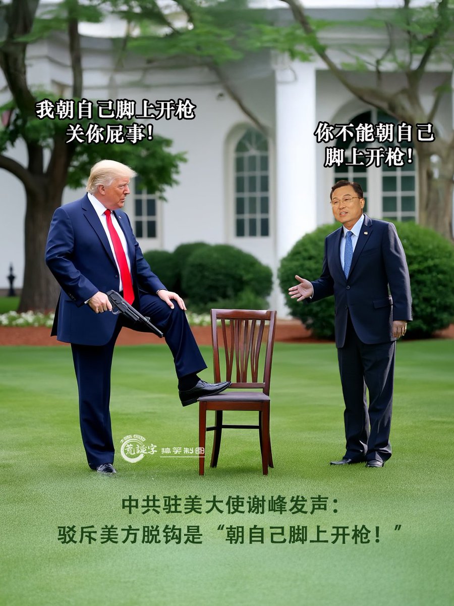 最近,中共驻美大屎谢疯发声:驳斥美方脱钩是“朝自己脚上开枪!”并说:中国永久正常贸易关系地位不是美单方面恩惠,而是义务!合作共赢是中美最好选择!#特朗普 #驻美大使 #谢峰 #讽刺 #搞笑 #漫画 #梗图