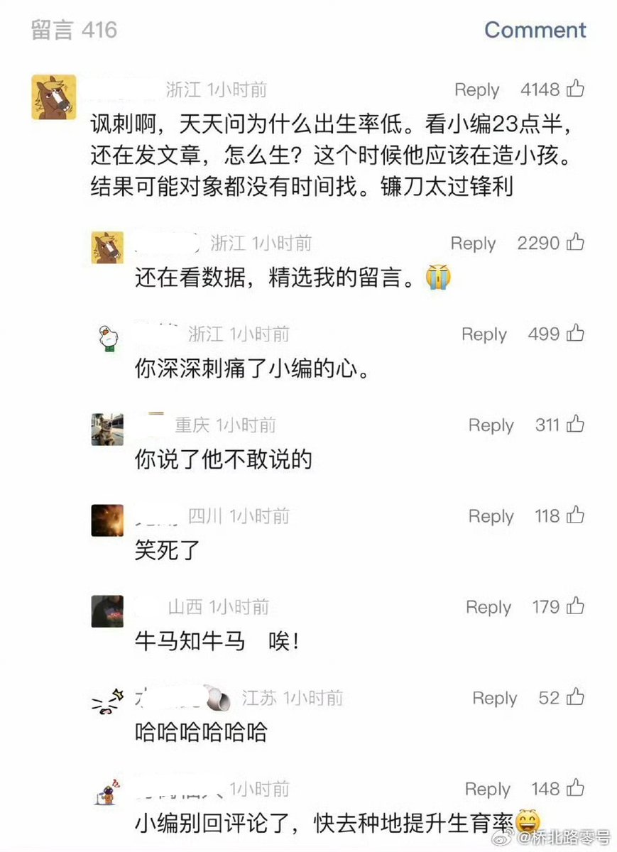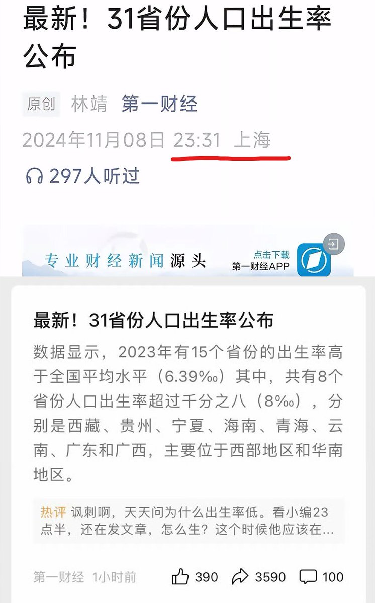 12月11日(发布) 近期,第一财经报道称,“最新!31省份人口出生率公布” 该报道于23:31分发布。 对此网友表示:“讽刺啊,天天问出生率那么低,看小编23点半还在发文章,怎么生?”