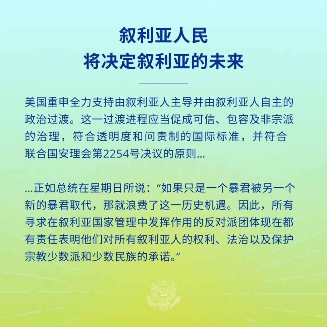 美国对叙利亚局势的表态:“如果只是一个暴君被另一个新的暴君取代,那就浪费了这一历史机遇。”