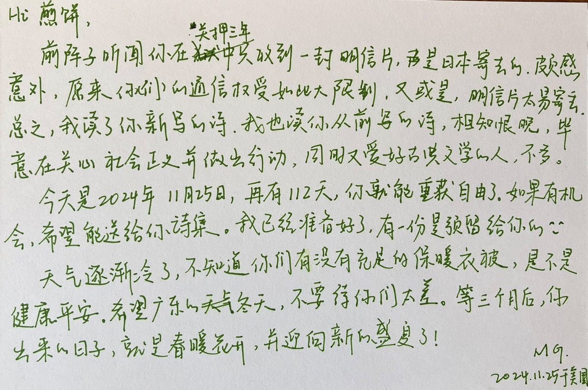 #明信片 煎饼,前阵子听闻你在关押三年中只收到一份明信片,是日本寄去的。颇感意外,原来你们的通讯权收到如此大的限制,又或是,明信片太易寄丢。我读了你新写的诗,也读了你从前写的诗,相知恨晚。毕竟在关心社会正义并作出行动、同时又爱好古典文学的人不多...