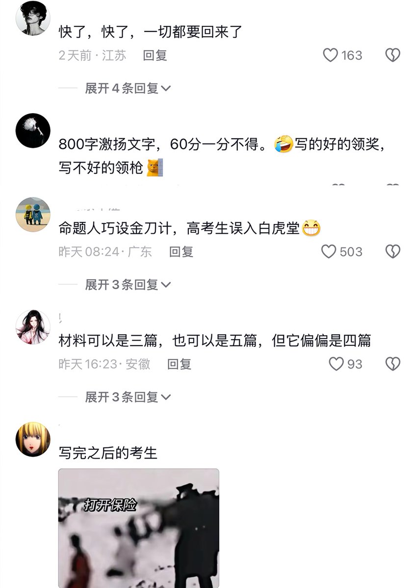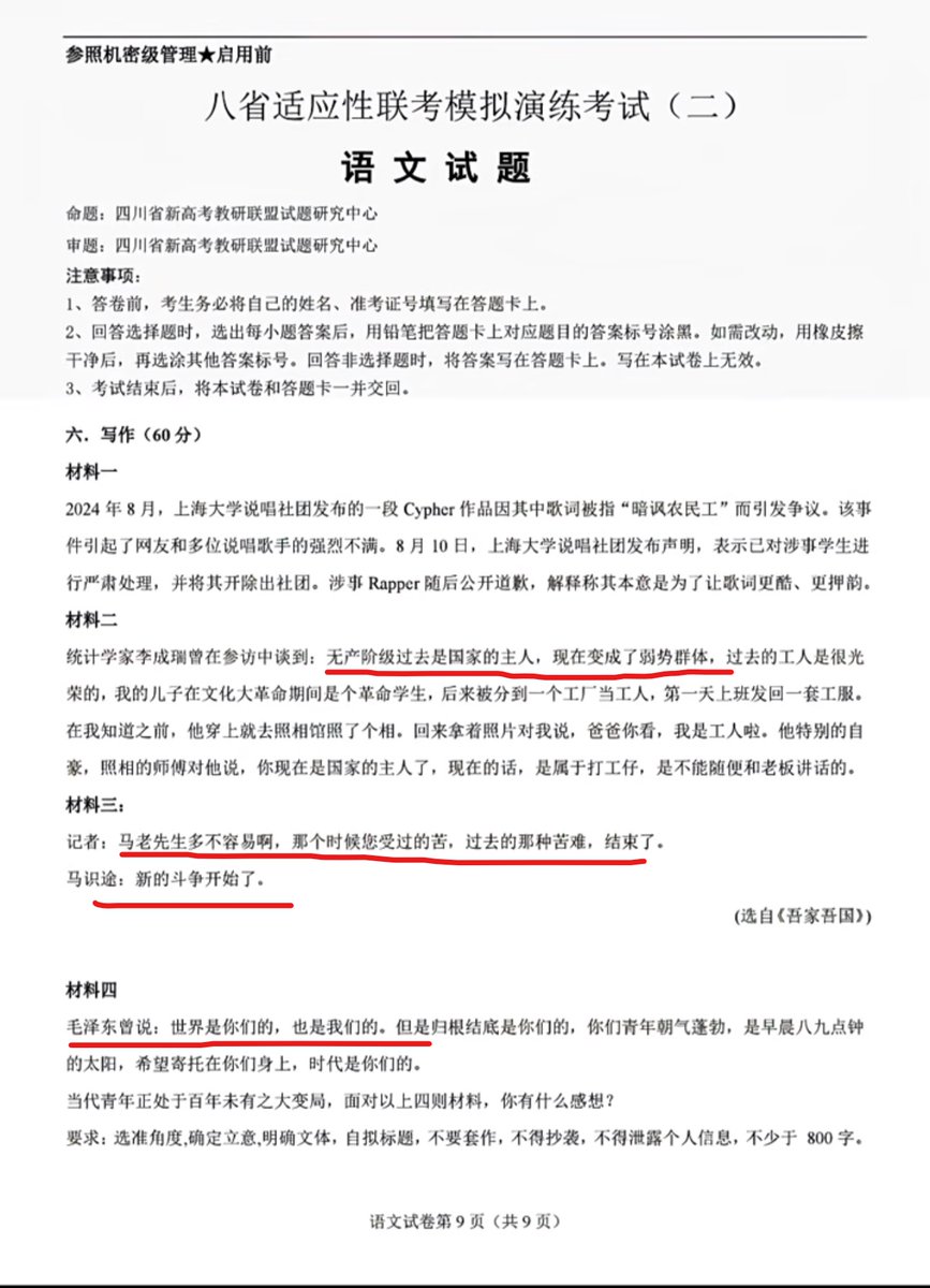 网传一份八省联考语文模拟试题,其中,写作题目中提到“无产阶级是国家的主人,现在却成了弱势群体”“新的斗争开始了”“毛泽东说,世界是你们的,也是我们的”等内容引发网友调侃。 网友回复“我觉得这次的题目可以叫《四文帮》”“考生写完后可以被枪毙了”