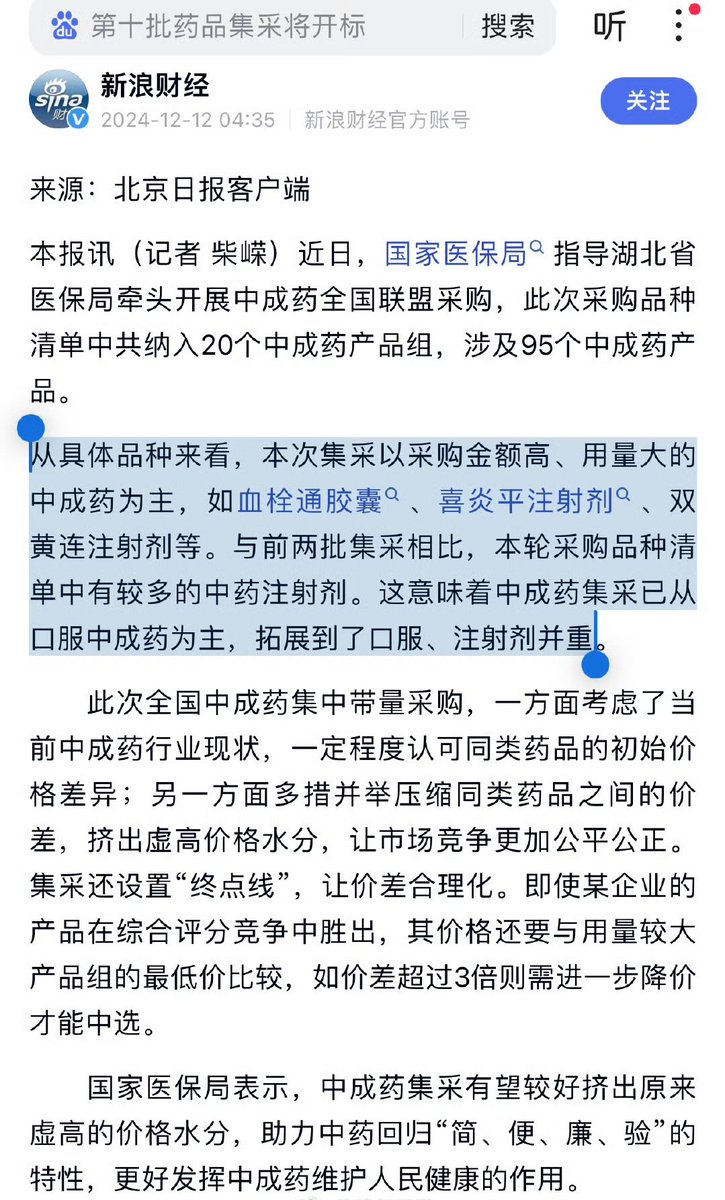 近日媒体报道,国家医保局指导湖北省医保局牵头开展中成药全国联盟采购。 本轮采购品种清单中有较多的中药注射剂。这意味着中成药采集已从口服中成药为主,扩展到了口服、注射剂并重。 网友回复“孙思邈都想不到还可以玩注射”