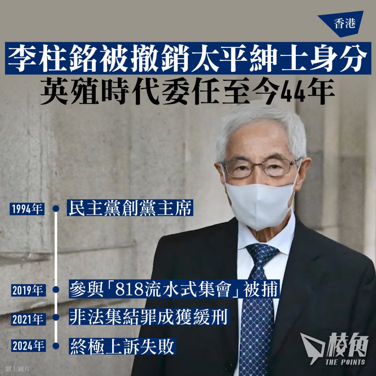 港府周五宣布:李家超据《太平绅士条例》撤销资深大律师李柱铭的太平绅士身份,他于英殖时代被委任太平绅士。 李柱铭曾与黎智英等民主派人士参与19年8月18日举办的集会,要求港府落实五大诉求,被控非法集结罪,被判刑11个月,缓刑2年。 据《条例》,若被委任后,在任何地方被定罪,行政长官可撤销太平绅士身份。