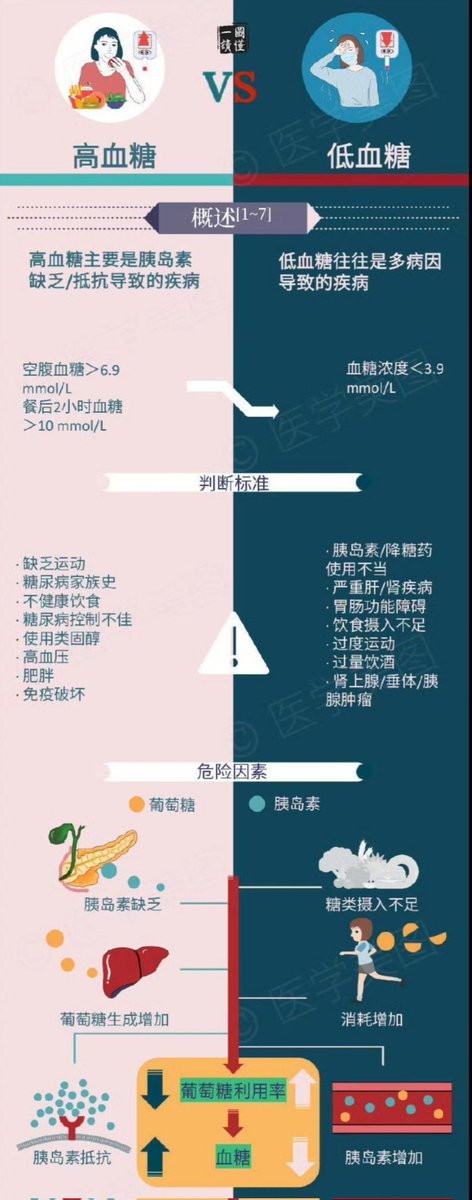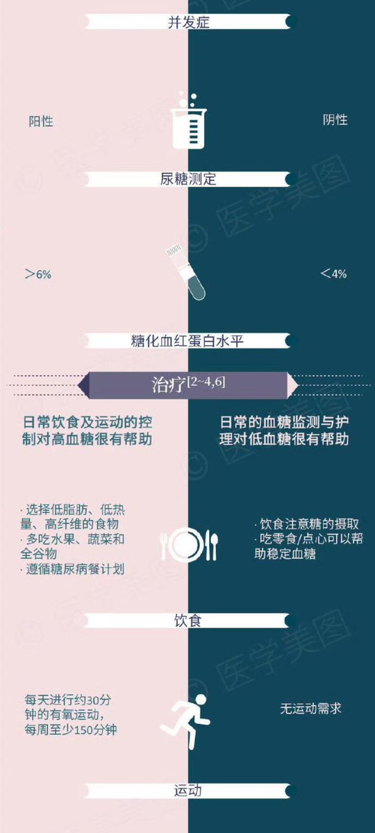 根据血液中葡萄糖浓度的异常情况,可以对血糖的高低进行判断。二者在危险因素、发病机制和临床表现上都有着很大的区别。