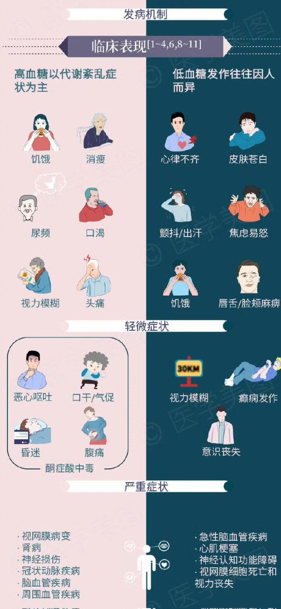 事实上,不管是低血糖,还是高血糖,对于人体的伤害都是巨大的。严重高血糖可导致酮症酸中毒,而低血糖严重时亦可导致意识丧失等症状。
