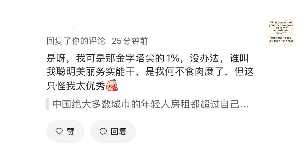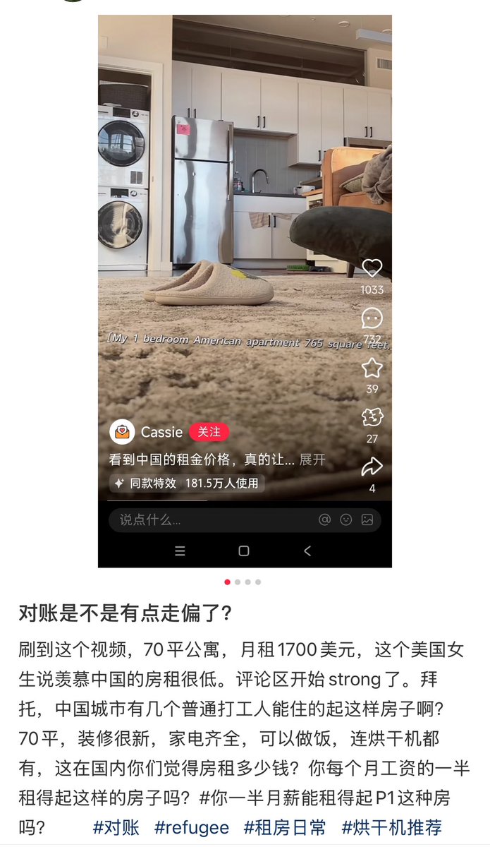 这几天逛小红书,从最开始的收猫税比才艺看美女帅哥,很快进到中美对账。很有意思前几天小红书上画风还是500万在上海无法躺平,这几天都月薪八千能存一半了。美国人过得太惨了,我看得眼泪哗哗的,要警惕美国人免签来华然后黑下来抢夺我们的社会资源。有时看得入戏了我也评论……