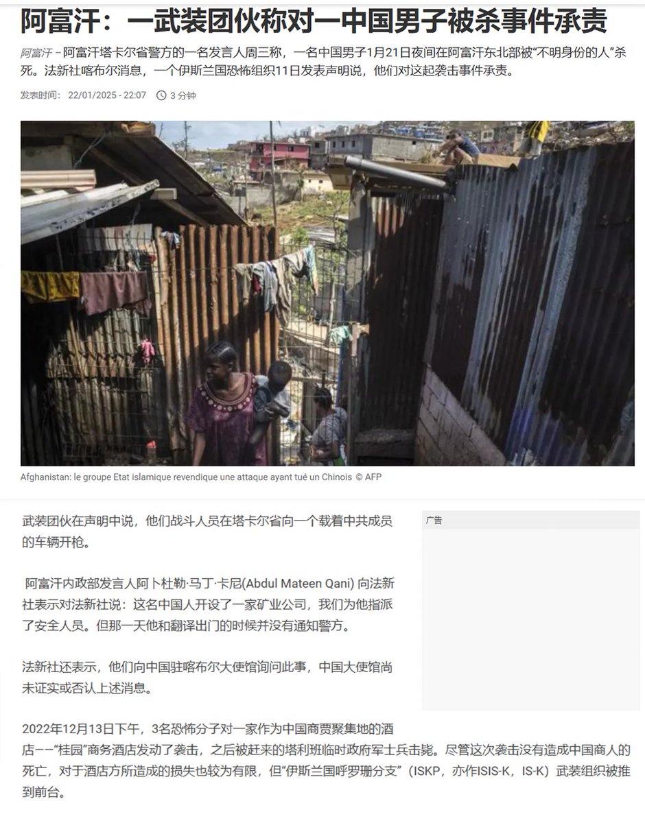 1月21日,一名中国男子在阿富汗东北部被 “不明身份的人” 杀死,阿富汗内政部表示,这名中国人开设一家矿业公司,我们为他指派了安全人员,但那天他和翻译出门时没有通知警方。