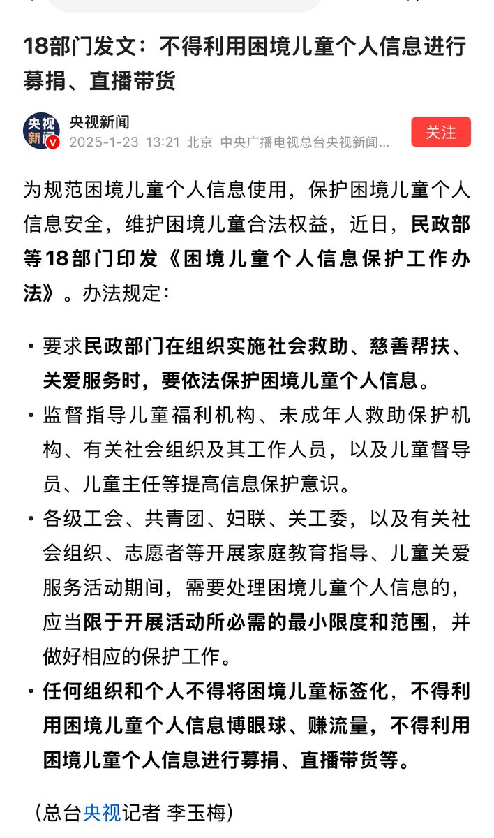 民政部等18部门发文:为保护好困境儿童的个人信息,任何组织和个人不得利用困境儿童个人信息博眼球、募捐、赚流量、直播带货。