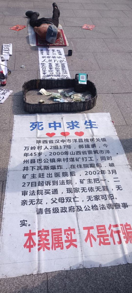 2月3日,陕西汉中。路边一名卖艺男子称,他2000年在晋城市巴公镇一矿场打工时,因瓦斯爆炸受伤,住院期间被矿主赶出医院,矿主还买通了法院,目前无依无靠无家可归,请政府调查事实。