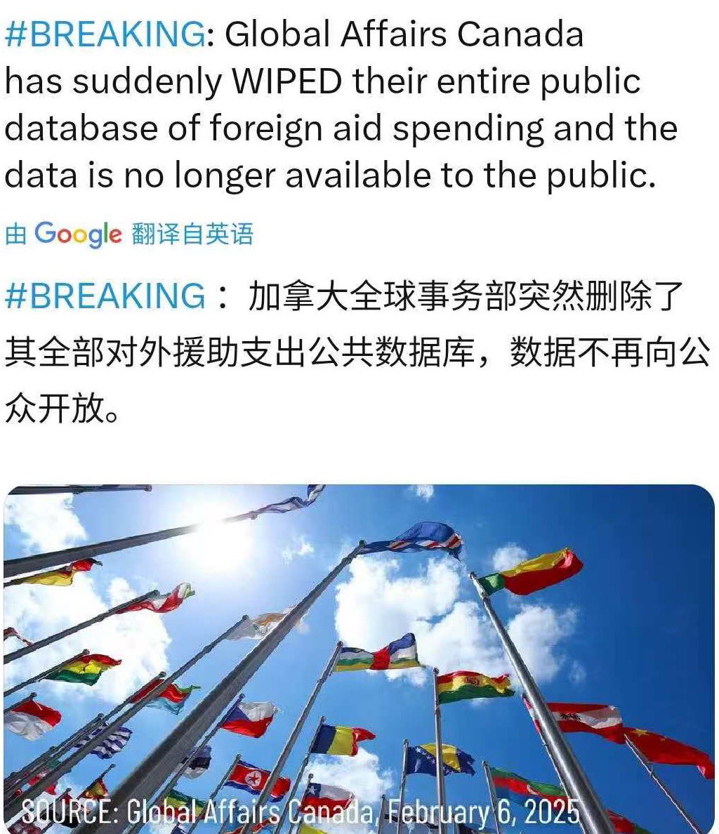 正当美国这边风风火火刮骨疗毒清理内部污垢的时候,在美国国际开发署被马斯克打成过街老鼠的时候,加拿大那边跟美国国际开发署差不多的一个机构,加拿大全球事务部,突然删除了其全部对外援助的公共数据库。其官方数据也不再对公众开放。