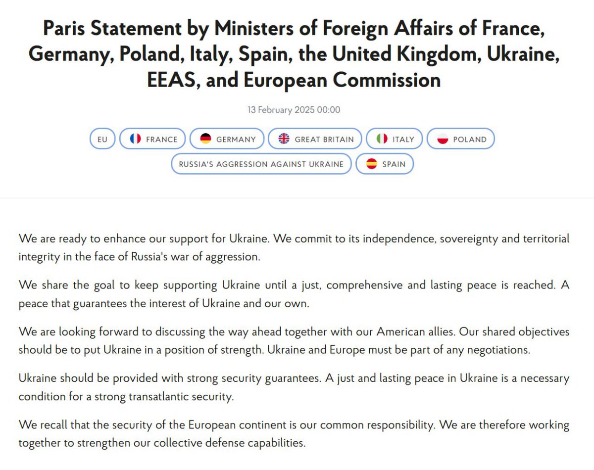 法國、德國、波蘭、意大利、西班牙、英國、烏克蘭和歐盟外交部長聲明:“我們期待與我們的美國盟友討論前進的道路,我們的共同目標必須是確保烏克蘭的強勢地位,烏克蘭和歐洲必須參與任何談判。”