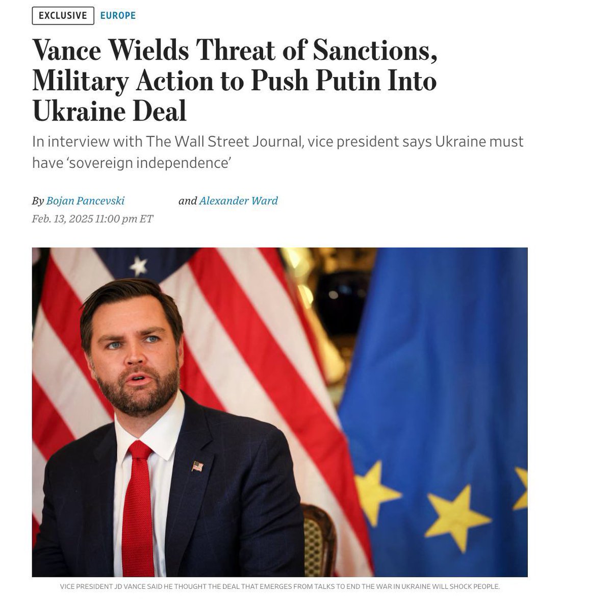 美國副總統表示,如果普丁不同意與烏克蘭達成保證基輔長期獨立的和平協議,美國將對莫斯科實施制裁,並可能向烏克蘭派遣美軍,如果莫斯科無法真誠進行談判,向烏克蘭派遣美國軍隊的選擇仍然“擺在桌面上”。萬斯說:“美國可以利用經濟槓桿手段,當然,還有軍事槓桿手段來對付普丁。”